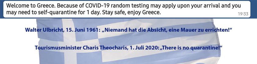 Mein Gesprächspartner, dessen Heimatadresse sich in einem Landkreis befindet, welcher aktuell Coronafrei ist, und der am Sonntag wieder zurück fliegt, ist soeben getestet worden. Nach dem Test ist er aufgefordert worden, sich in sein Hotel zu begeben. Er unterliegt nun einer 24-stündigen Quarantäne. Nachdem der Getestete dem Tester versucht verständlich zu machen, dass er nur 48 Stunden in Griechenland verbringt, zuckt der Tester mit den Schultern und sagt "Welcome to Greece" (Willkommen in Griechenland).
